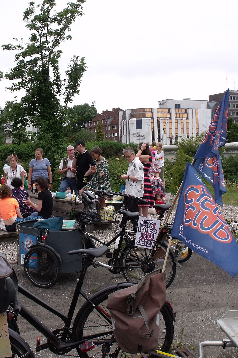Am letzten Tag des STADTRADELN 2025 führen wir mit ca. 50 Teilnehmenden eine gut 10 Kilometer lange Tour von St. Georg bis zum Lesecafé im Stadtpark. Dort gab es Zeit für eine Einkehr und einen Klönschnack. Der anschließende Heimweg zählte natürlich auch noch auf's STADTRADELN-Konto ein.