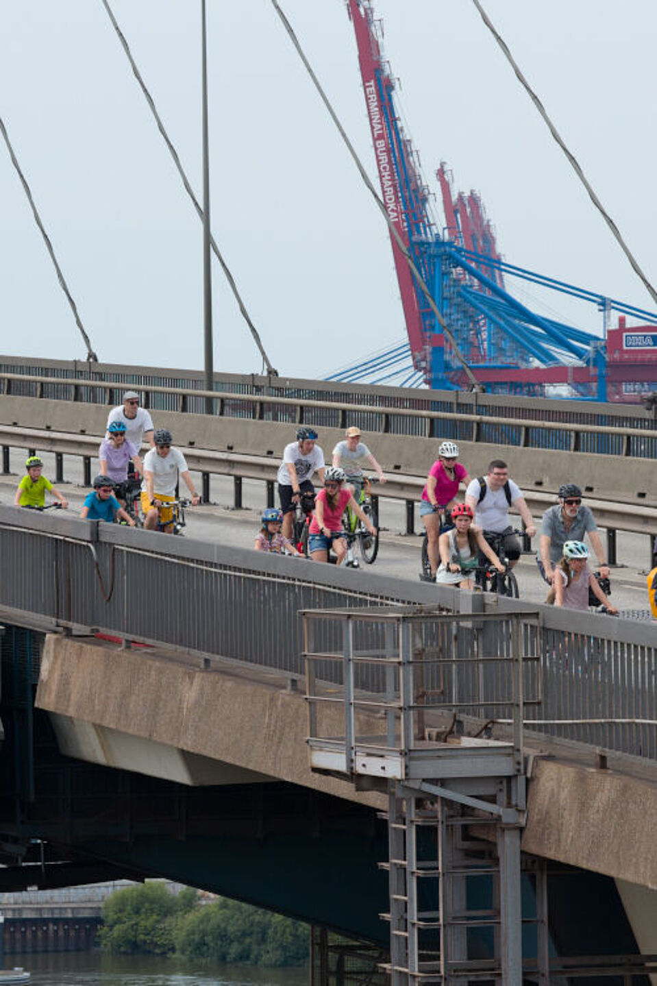 Bei der Fahrradsternfahrt am 22. Juni fuhren insgesamt ca. 11.000 Radfahrer*innen aus Hamburg und dem Umland gemeinsam für Radverkehrsförderung ins Hamburger Zentrum auf den Jungfernstieg. Zum Teil auf der wohl schönsten Demonstrationsstrecke Hamburgs hoch über der Elbe über die Köhlbrandbrücke. Die anschließende Teilstrecke auf der Autobahn zurück ins Zentrum gibt einen Einblick, wie das Fahren auf komfortabler Infrastruktur sein kann. Die beste Gelegenheit, mit vielen Menschen gemeinsam viele STADTRADELN-Kilometer zu sammeln!