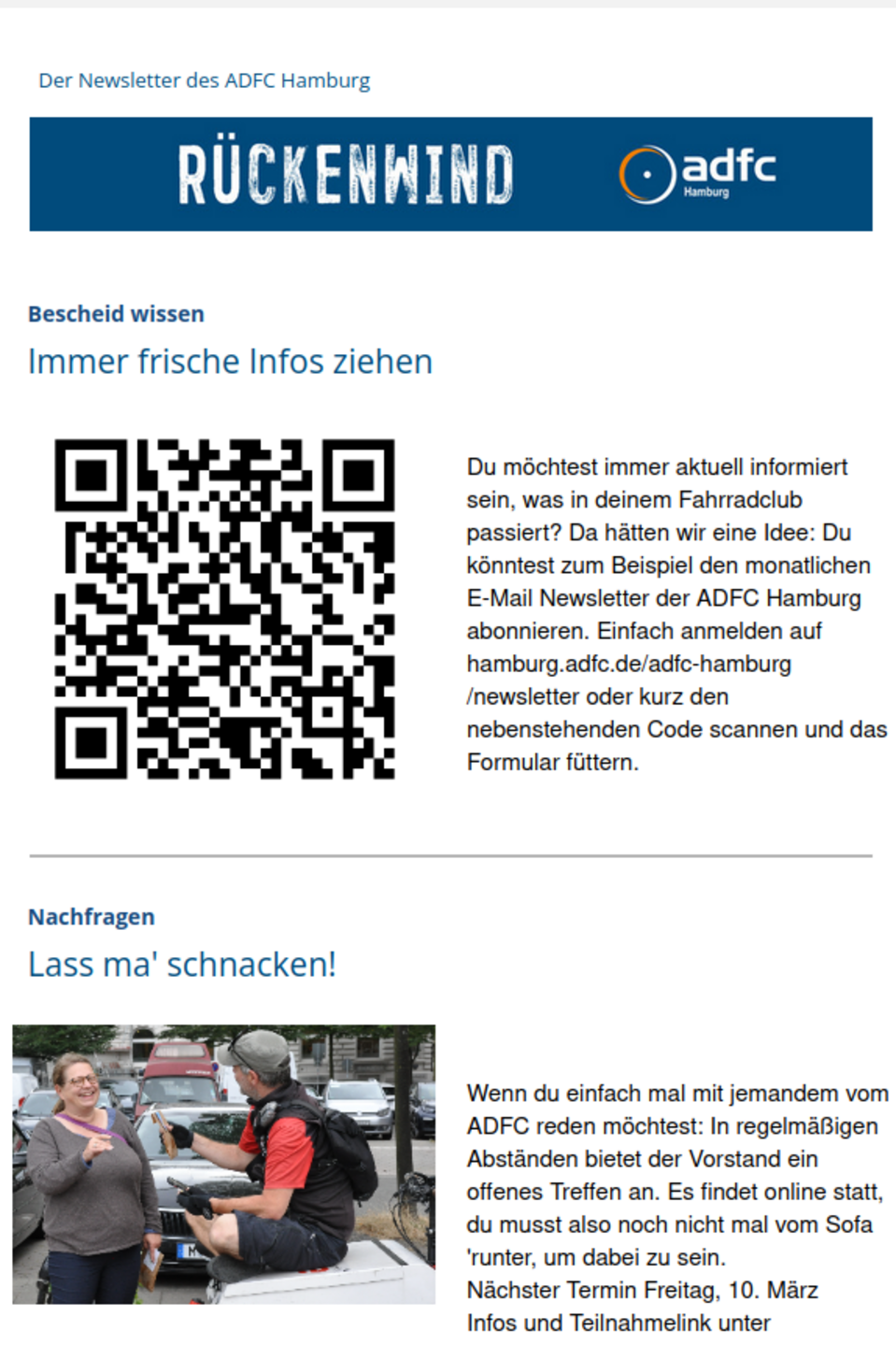 weiterlesenDer kostenlose Newsletter des ADFC Hamburg informiert ein bis drei Mal im Monat über Neuigkeiten zum Radfahren in Hamburg und über die Arbeit des ADFC.