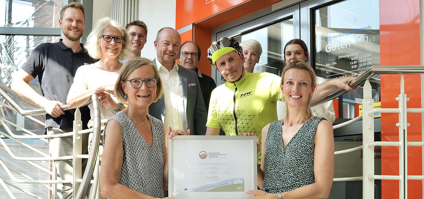 Volksbank Hamburg - ein motiviertes Team freut sich, das Zertifikat "Fahrradfreundlicher Arbeitgeber" von Heike Schambortski (ADFC Hamburg, links) zu erhalten. © Volksbank Hamburg