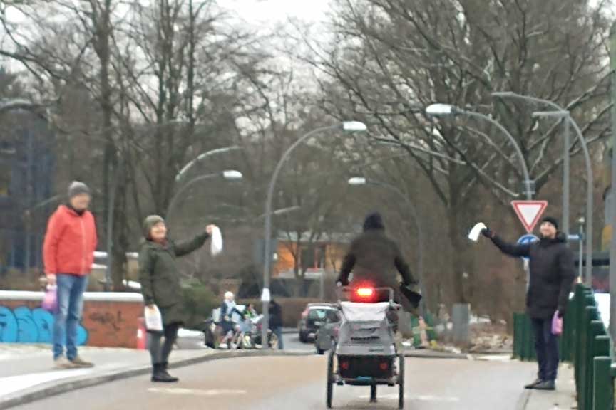 Bei frostigen Temperaturen haben wir heute auf dem Autobahndeckel in Altona Äpfel an Radfahrende verteilt. Dies war unser kleines Dankeschön zum diesjährigen Winter Bike to Work Day an alle, die sich nicht davon abschrecken lassen bei Wind und Wetter das Rad zu nutzen.