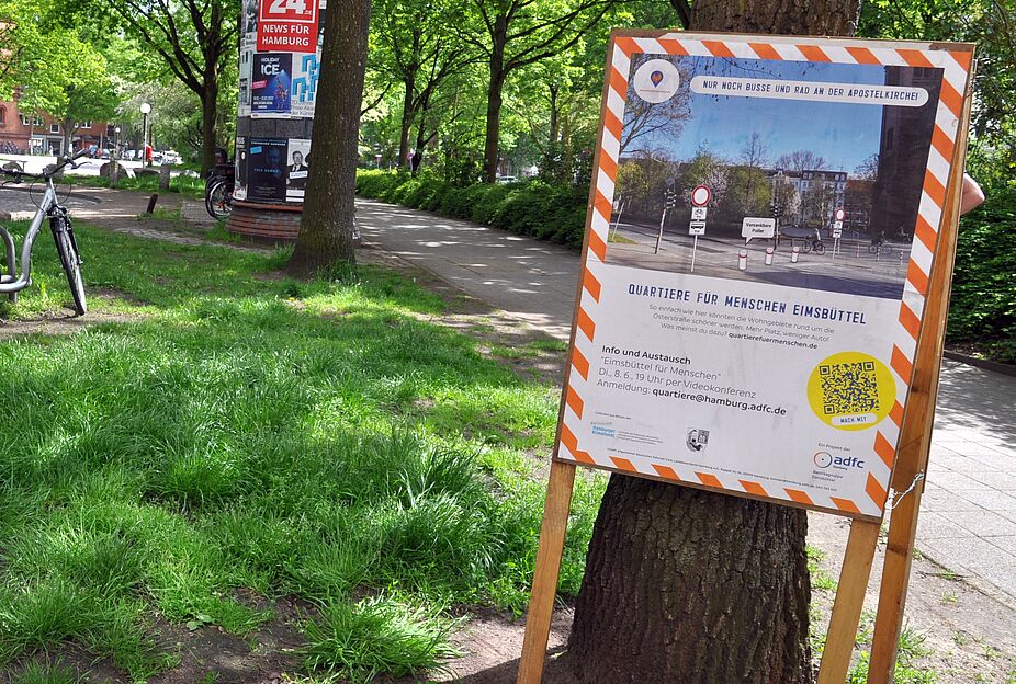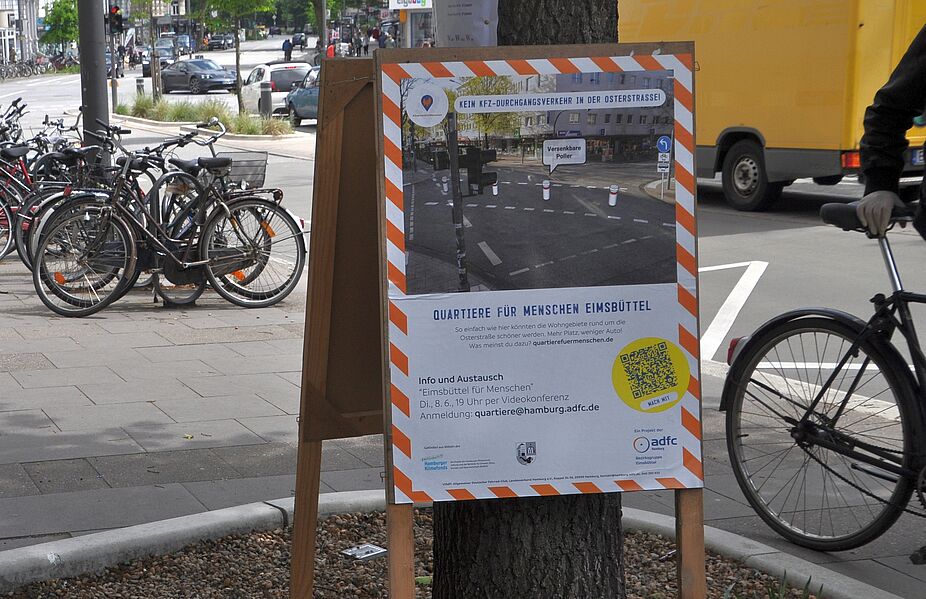 Am Dienstag, den 8. Juni 2021, 19 Uhr, lädt der ADFC zur Online-Veranstaltung „Eimsbüttel für Menschen“ für mehr Verkehrsberuhigung und Lebensqualität rund um die Osterstraße ein. Straßenplakate im Viertel zeigen die Ideen vor Ort.